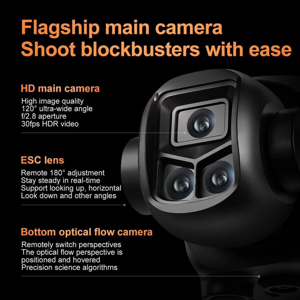 1. Front wide-angle HD WIFI lens, equipped with optical flow positioning HD lens at the bottom. The servo gimbal design improves stability, and adds EIS electronic image stabilization to make the shooting clearer