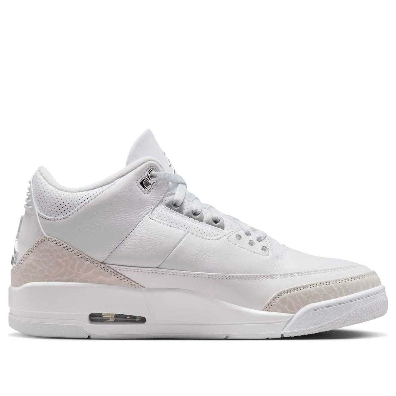 The iconic Air Jordan 3 "Pure Money" returns in Summer 2025! This all-white leather sneaker, accented with metallic silver, boasts the original's clean design and "Pure $" embroidery. A timeless classic, updated for a new generation.