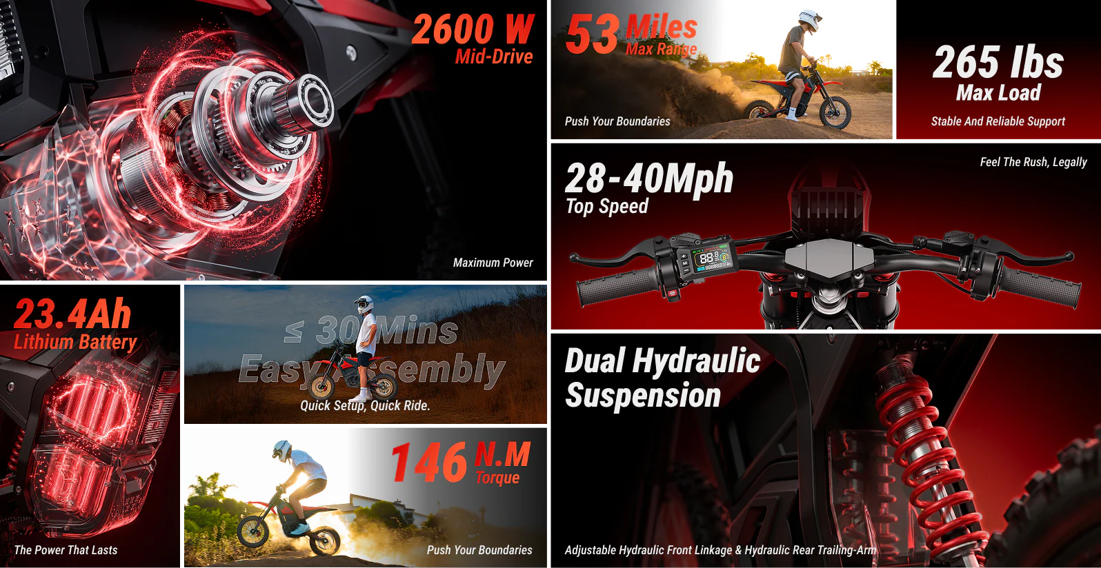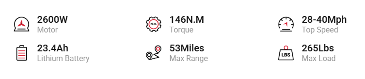 The 2600W mid-drive motor drives you smoothly up to 40 MPH, delivering precise control and rock-solid stability through every turn and jump. Twist the throttle and experience true dirt bike performance—pure adrenaline, total confidence. |
