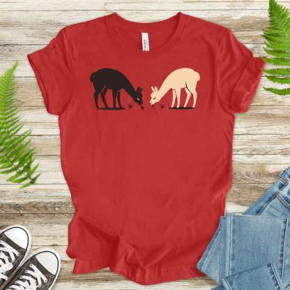 A black alpaca and a white alpaca