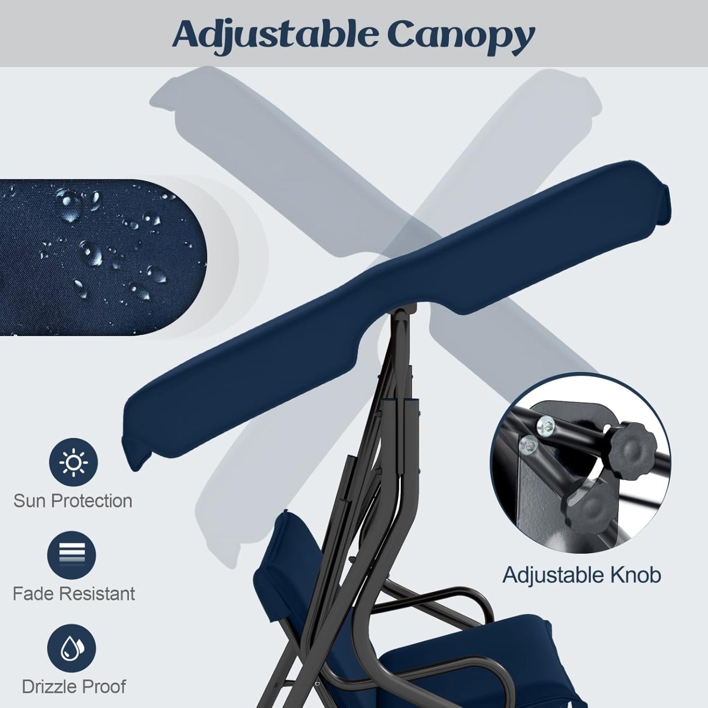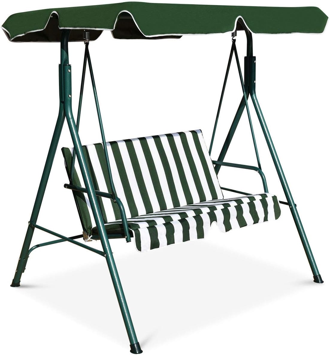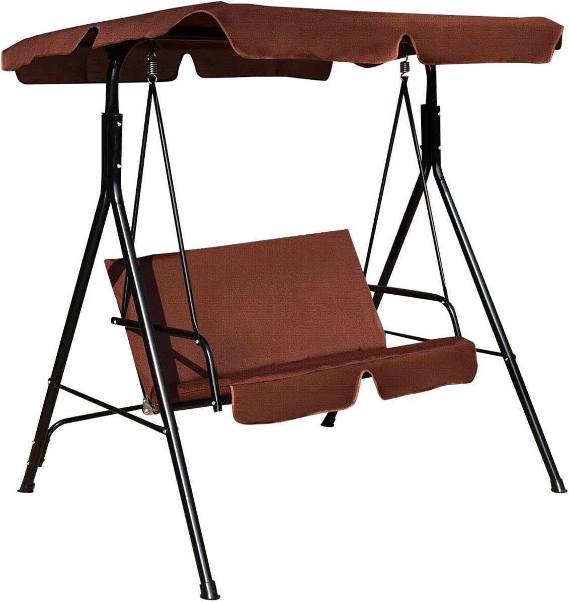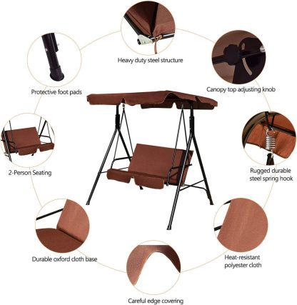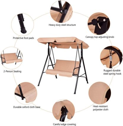 - Waterproof & Sun protection: Polyester and oxford cloth is waterproof and powder-coated finish is rust-resistant. You can leave the swing outdoors after late-night barbecues and gatherings. In sunny days canopy will protect you from sunlight.