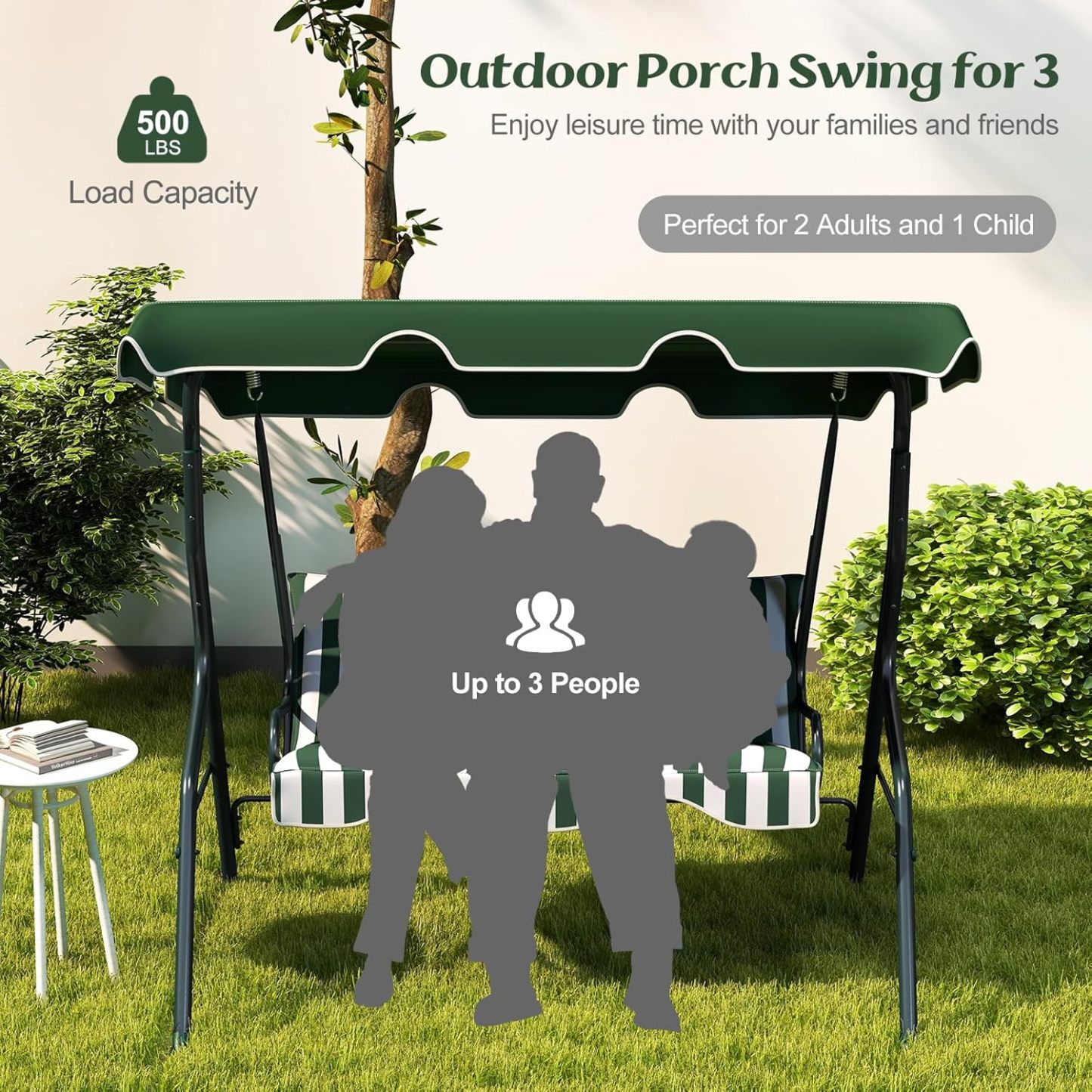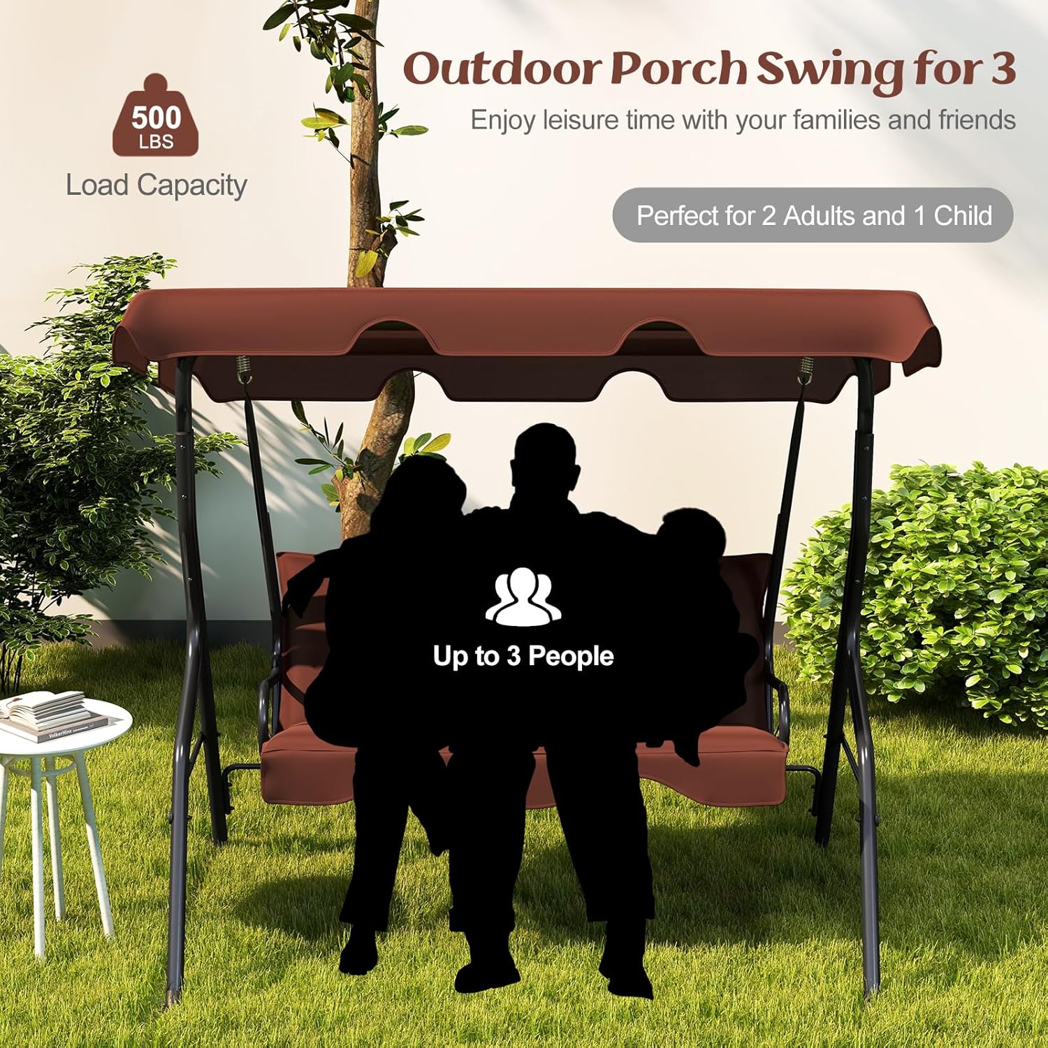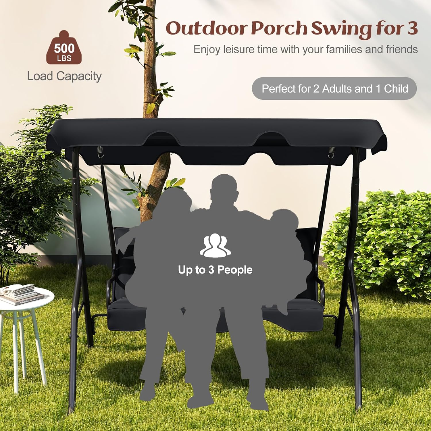 - Stable & Durable: Patio swing is made of steel frame, which ensures large weight capacity(approx: 500lbs) and sturdy construction. Powder-coated finish and polyester fabric provides long-lasting enjoyment for years to come.