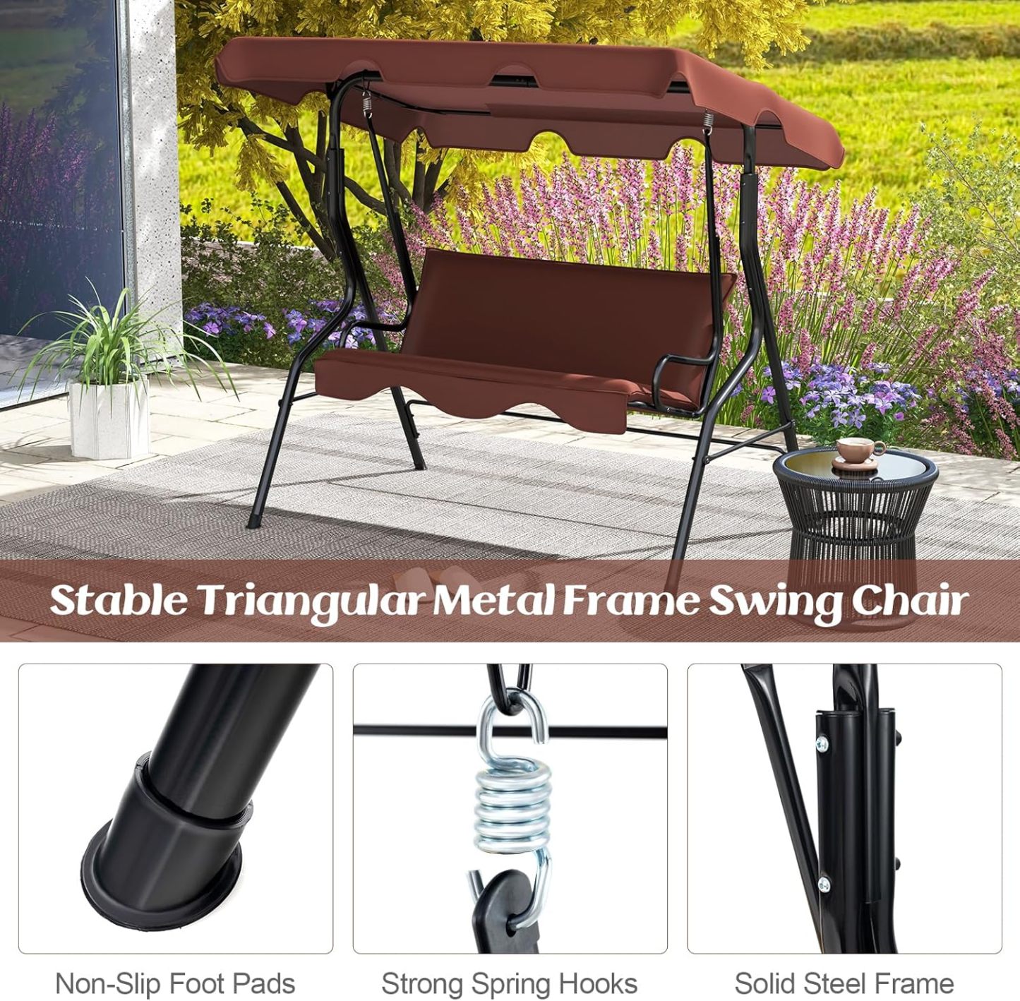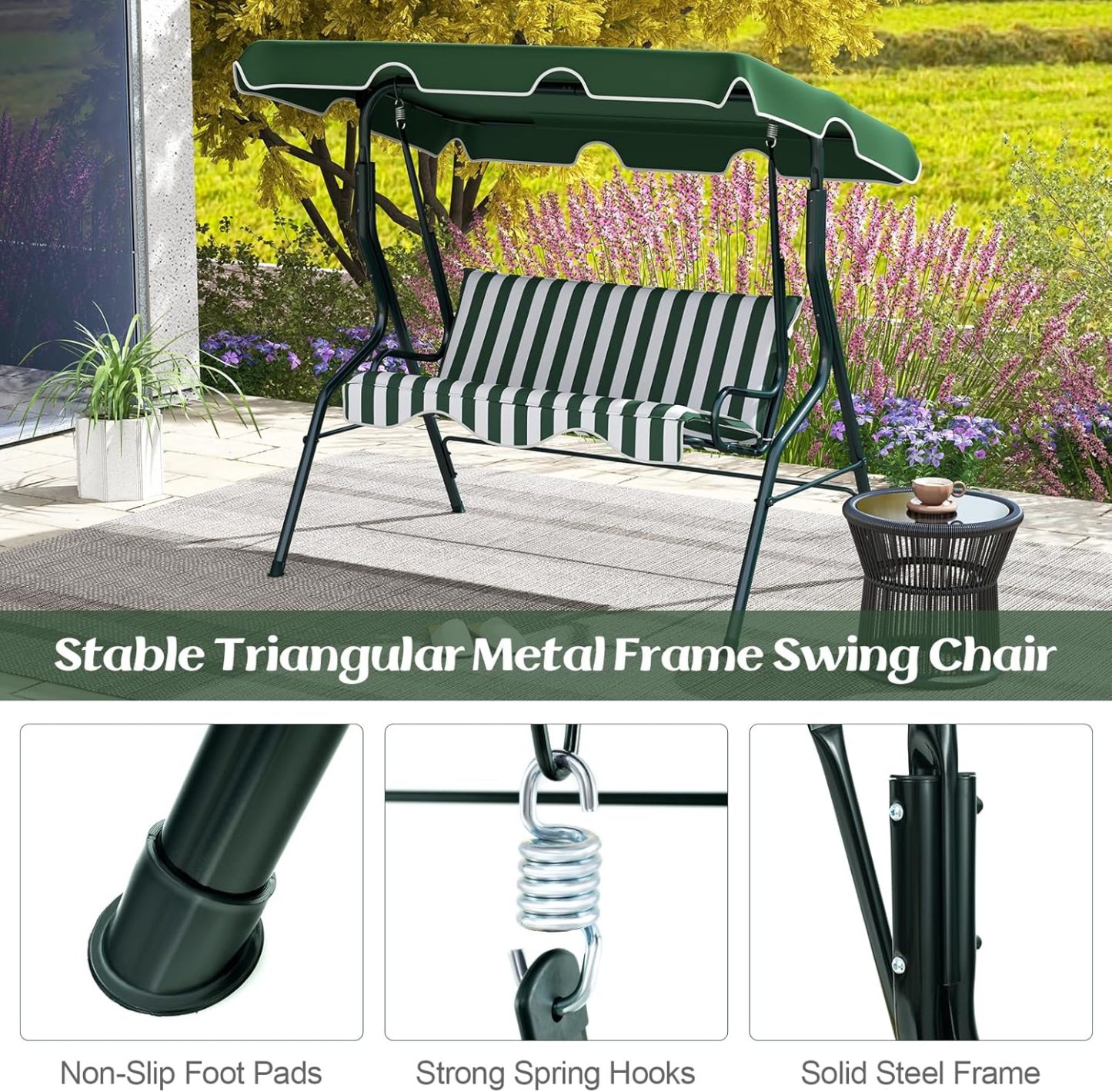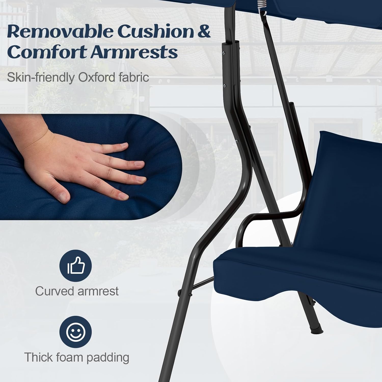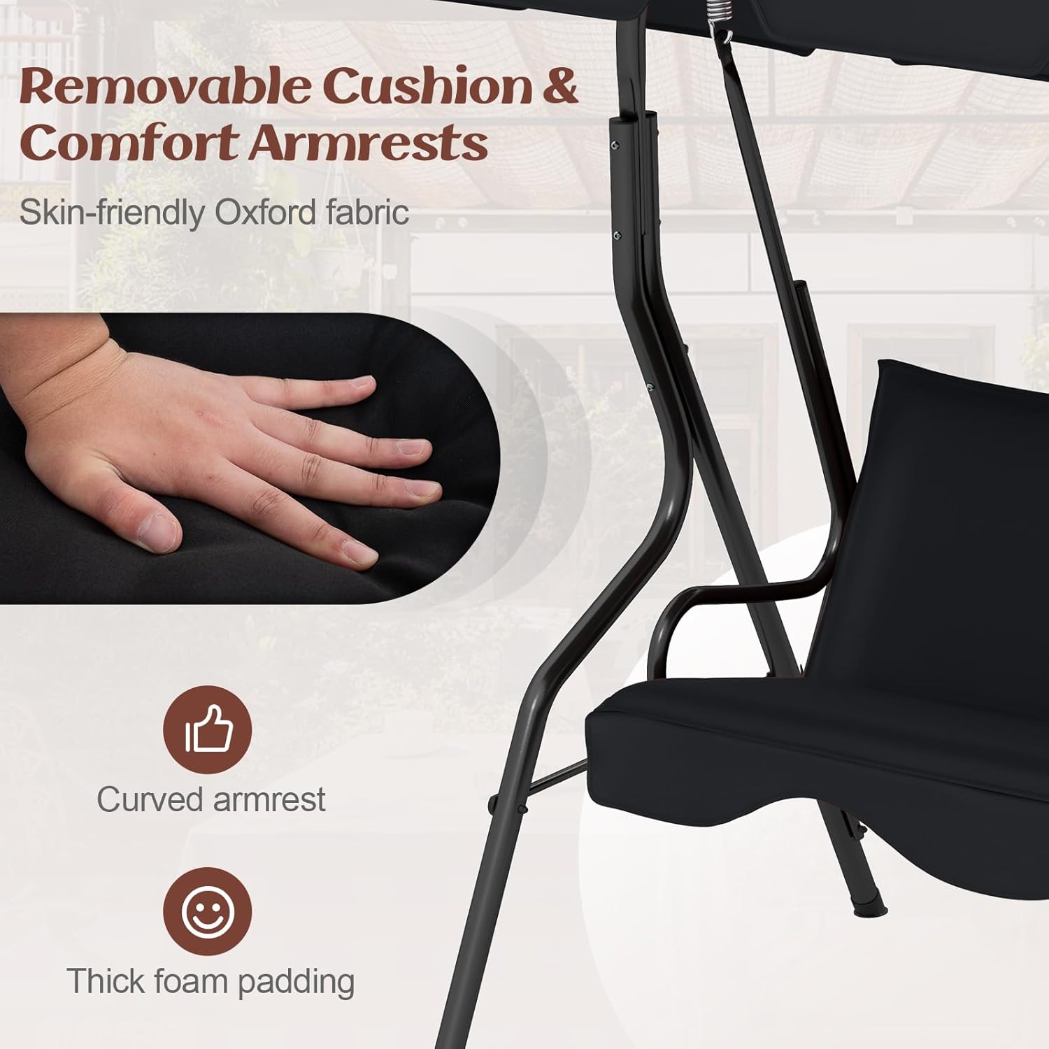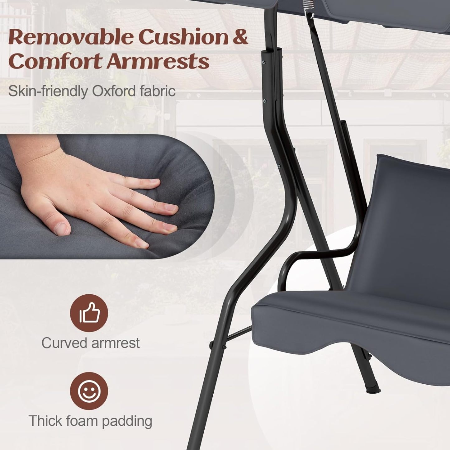 - Soft cushions & Feet pads: Soft cushions (pillows in the pic are not included)with 3-person seating is perfect for socializing with friends or enjoying summertime with family. The patio swing constructs plastic anti-skid feet pads. It makes the patio swing more safe in rainy days and also prevent floor from scratching.