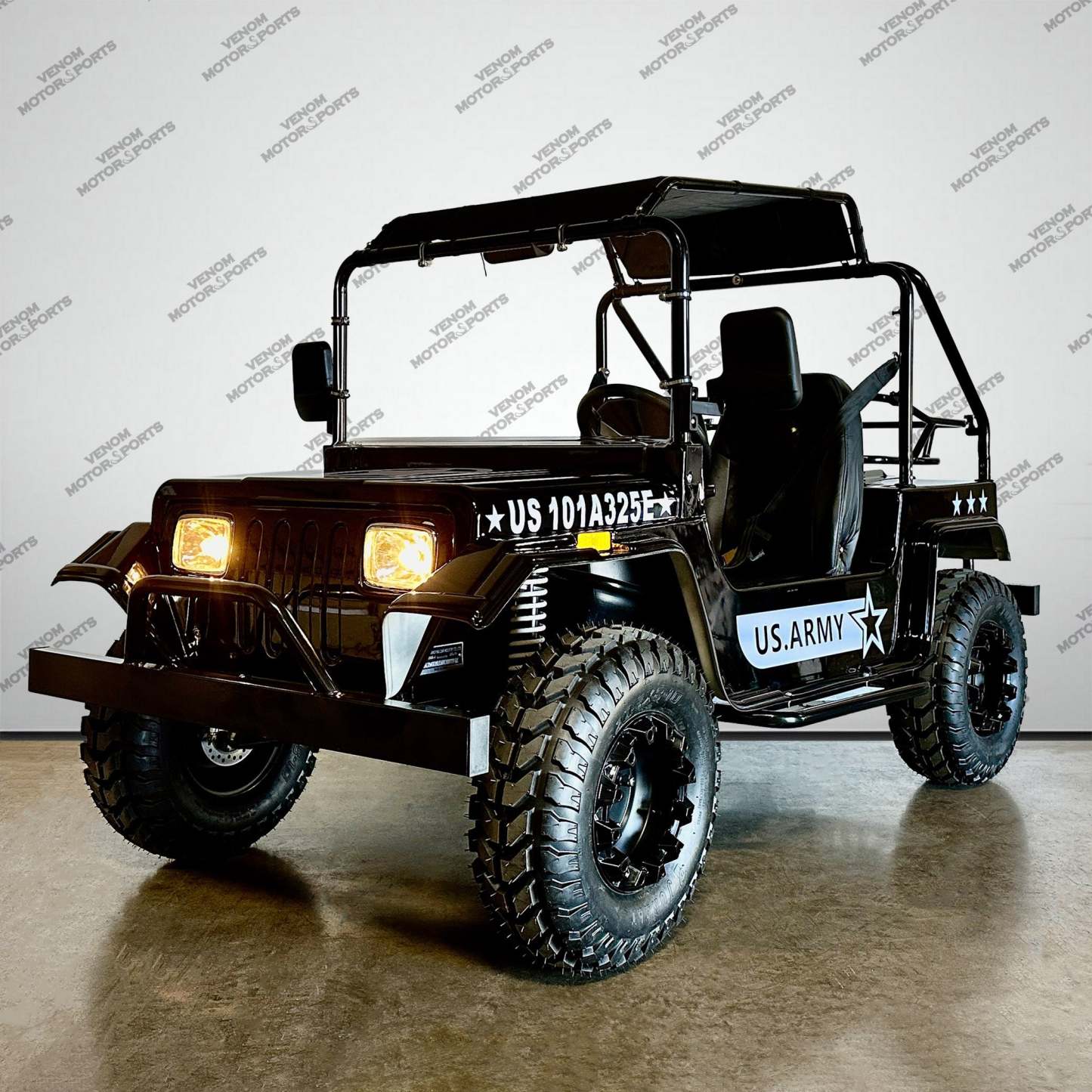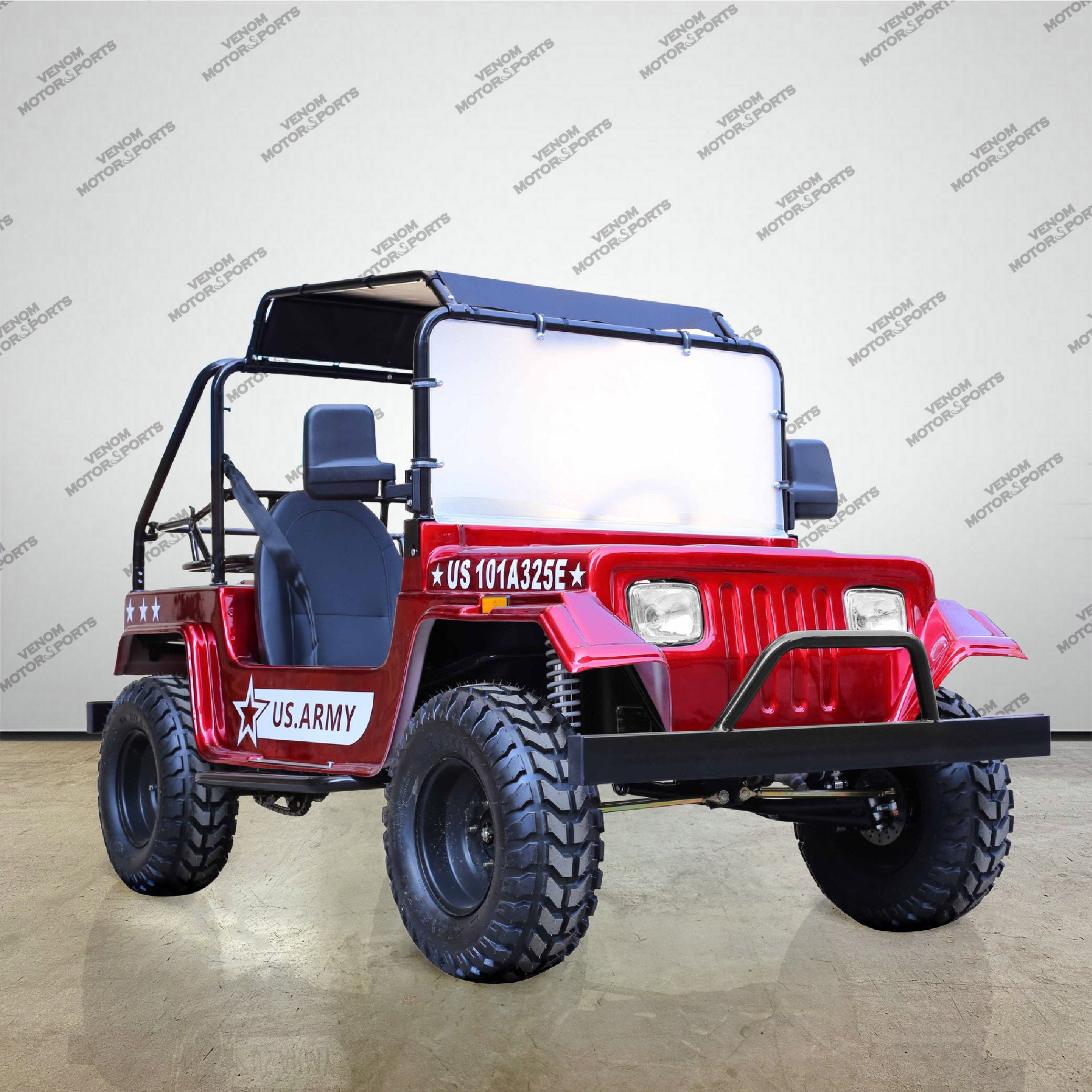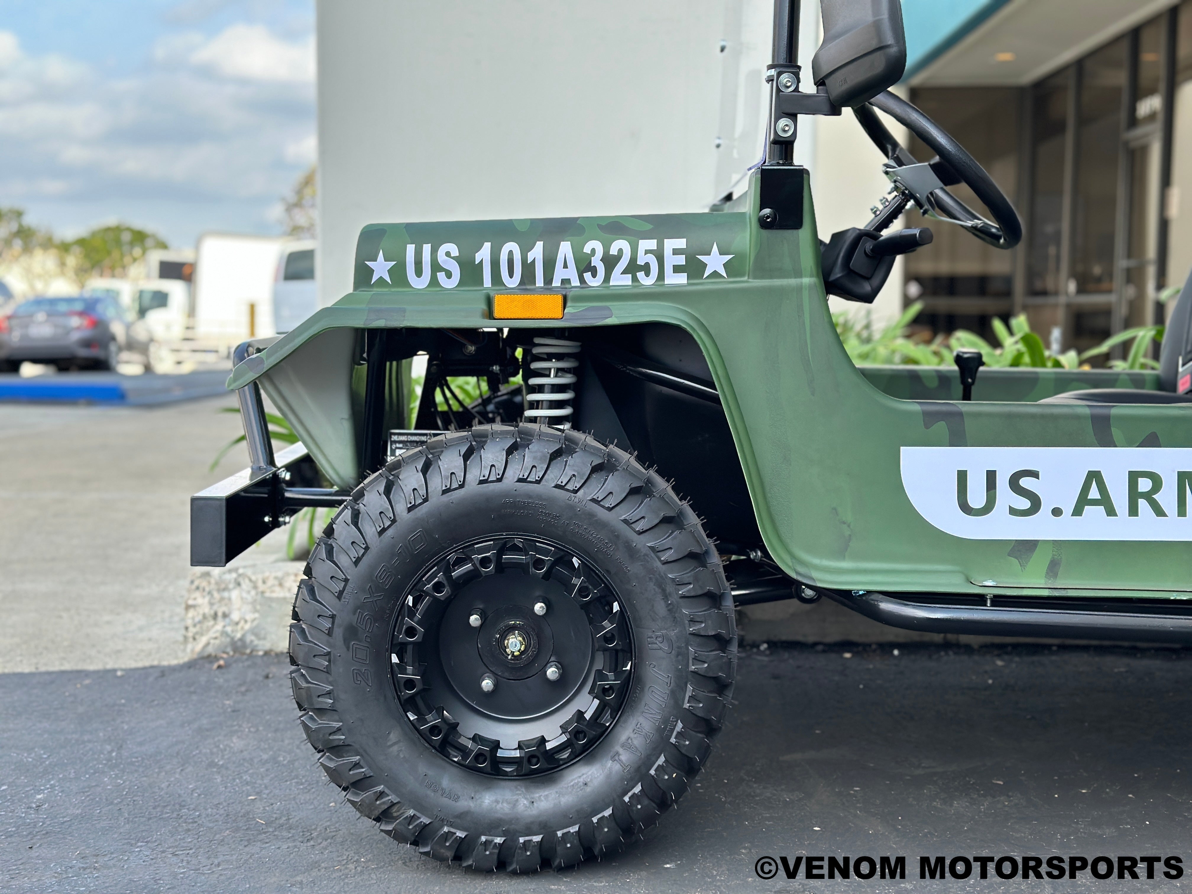 The Venom 200cc Mini Jeep, Willys Edition, is a full-size, automatic vehicle that runs on 200cc of gas. As an army golf cart, it offers reliable and powerful performance, making it perfect for off-road adventures. With its full-size design, it ensures comfortable seating and plenty of space for all your gear.