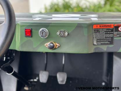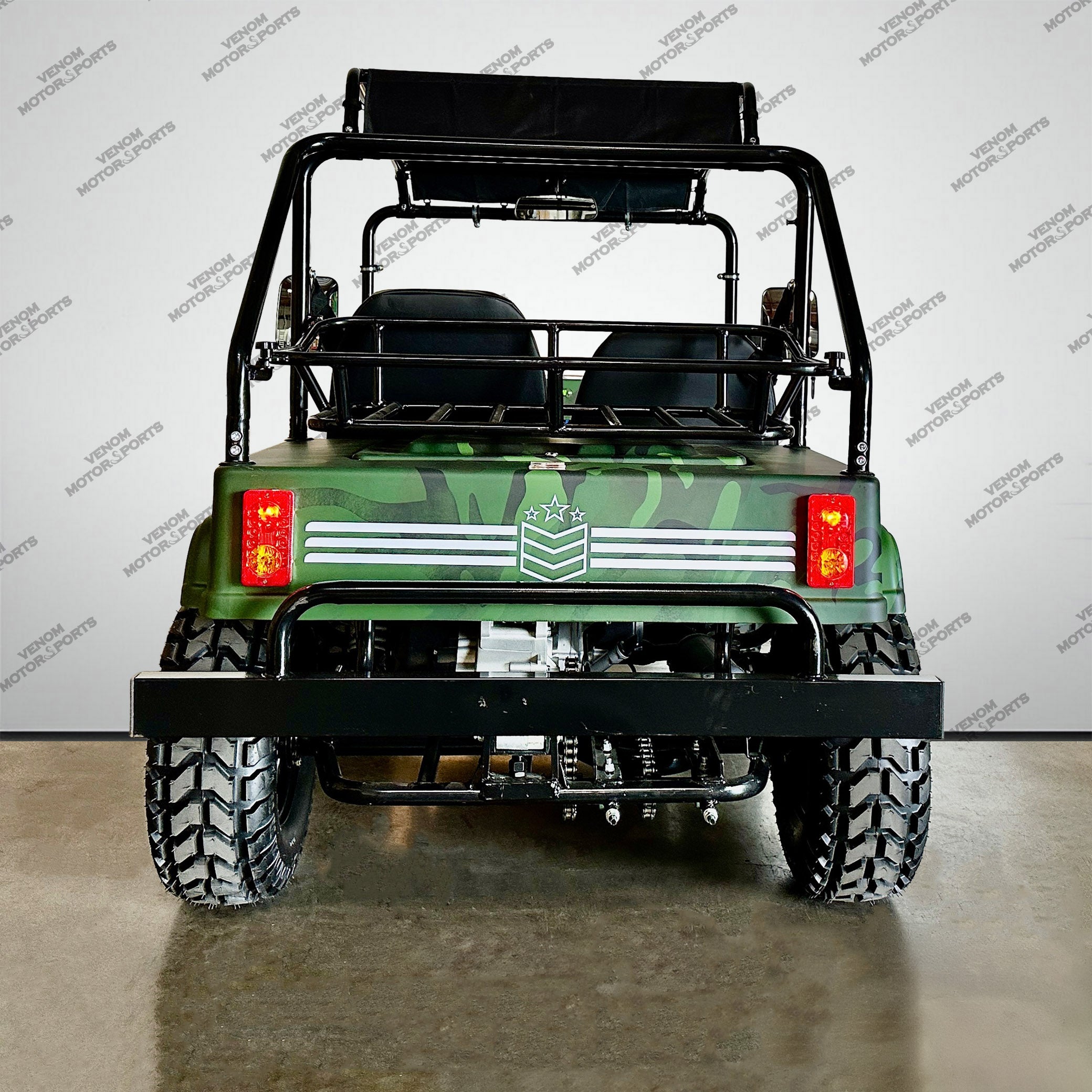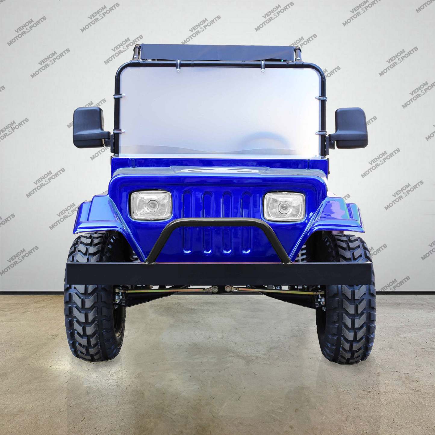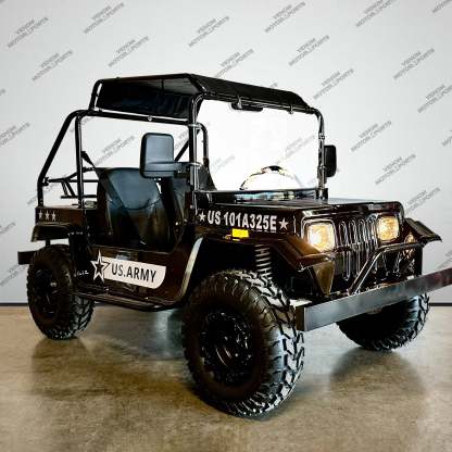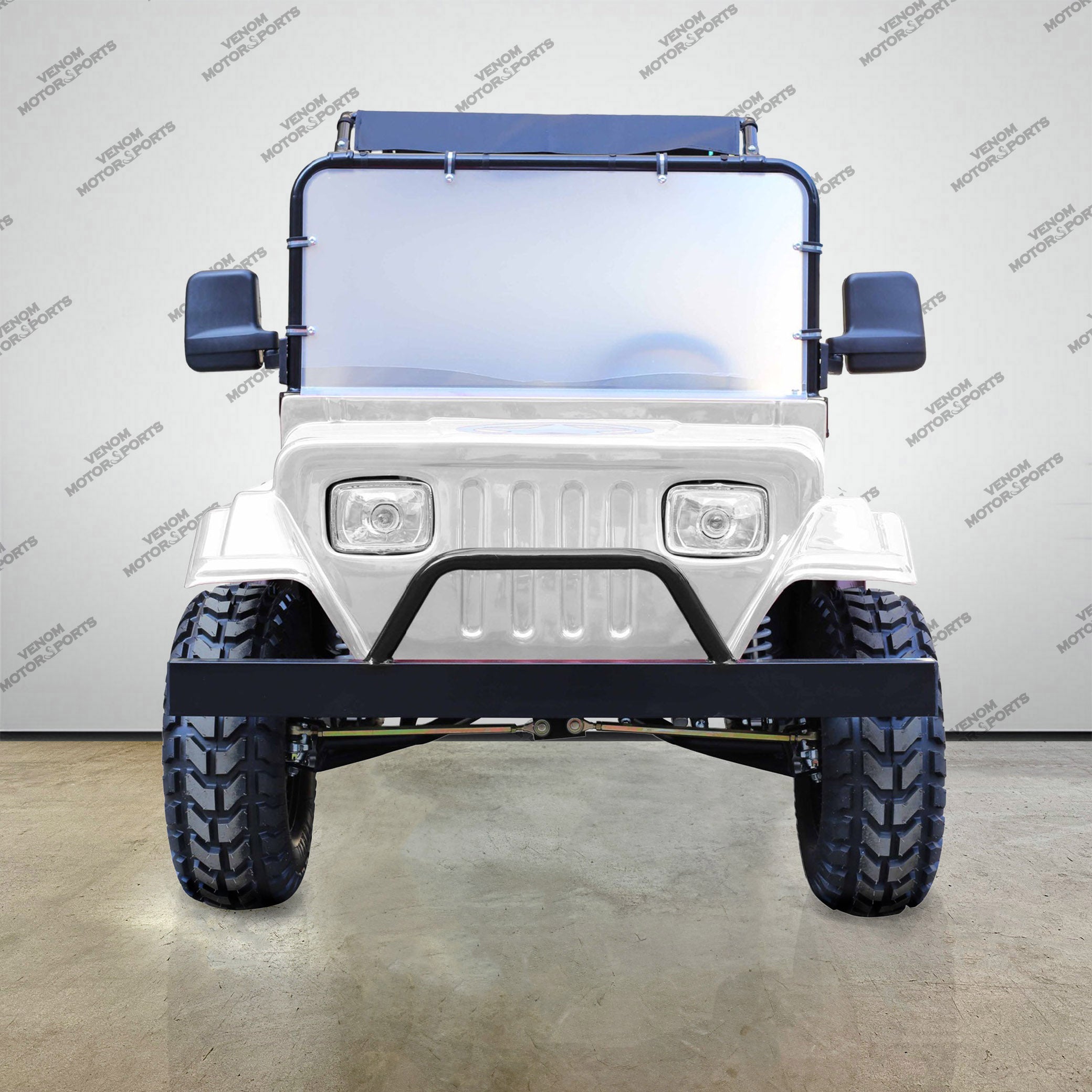 The Venom 200cc Mini Jeep, Willys Edition, is a full-size, automatic vehicle that runs on 200cc of gas. As an army golf cart, it offers reliable and powerful performance, making it perfect for off-road adventures. With its full-size design, it ensures comfortable seating and plenty of space for all your gear.